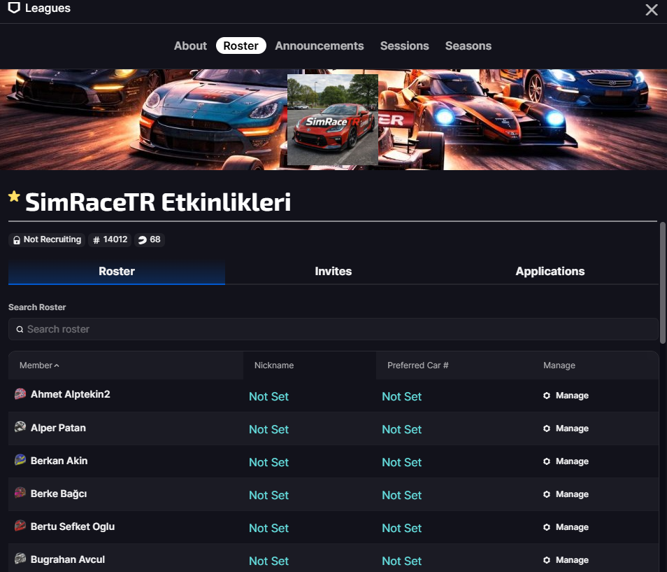 Lig katılımcılarını ve tüm detayları iRacing arayüzünde Leagues > My Leagues bölümünden görebilirsiniz. Ayrıca yarış günleri yarışlara buradan katılacaksınız. Puan tablosu ve tüm detayları bu kısımdan takip edebilirsiniz.